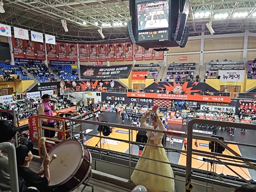 *2025년 1월, 안산 OK 저축은행 배구단(지금은 부산으로 이전) 경기장에서 치어리더가 한복을 입고 공연하는 모습